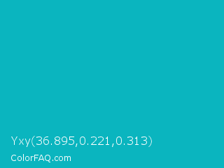 Yxy 36.895,0.221,0.313 Color is a normal cyan color and the nearest color is Tiffany Blue #0abab5. Hex code #0ab5bf and RGB value is rgb(10,181,191). In RGB color space, this color is composed of 4% red, 71% green, 75% blue, In CMYK color space, this color is composed of 95% cyan, 5% magenta, 0% yellow , 25% black , In HSL color space, this color has a hue angle of 183° , 90% saturation and 39% lightness.