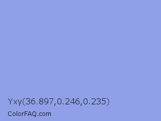 Yxy 36.897,0.246,0.235 Color is a light blue color and the nearest color is Portage #8b9fee. Hex code #90a0e8 and RGB value is rgb(144,160,232). In RGB color space, this color is composed of 56% red, 63% green, 91% blue, In CMYK color space, this color is composed of 38% cyan, 31% magenta, 0% yellow , 9% black , In HSL color space, this color has a hue angle of 229° , 66% saturation and 74% lightness.