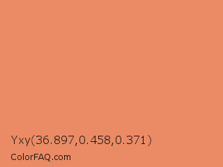 Yxy 36.897,0.458,0.371 Color is a light orange color and the nearest color is Big Foot Feet #e88e5a. Hex code #ea8b65 and RGB value is rgb(234,139,101). In RGB color space, this color is composed of 92% red, 55% green, 40% blue, In CMYK color space, this color is composed of 0% cyan, 41% magenta, 57% yellow , 8% black , In HSL color space, this color has a hue angle of 17° , 76% saturation and 66% lightness.
