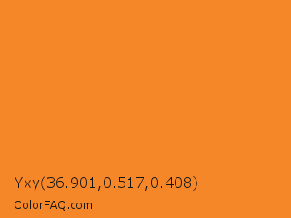 Yxy 36.901,0.517,0.408 Color is a normal orange color and the nearest color is Princeton Orange #f58025. Hex code #f58729 and RGB value is rgb(245,135,41). In RGB color space, this color is composed of 96% red, 53% green, 16% blue, In CMYK color space, this color is composed of 0% cyan, 45% magenta, 83% yellow , 4% black , In HSL color space, this color has a hue angle of 28° , 91% saturation and 56% lightness.