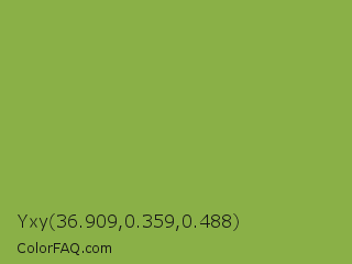 Yxy 36.909,0.359,0.488 Color is a normal green color and the nearest color is Sushi #87ab39. Hex code #8ab047 and RGB value is rgb(138,176,71). In RGB color space, this color is composed of 54% red, 69% green, 28% blue, In CMYK color space, this color is composed of 22% cyan, 0% magenta, 60% yellow , 31% black , In HSL color space, this color has a hue angle of 82° , 43% saturation and 48% lightness.