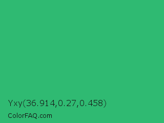 Yxy 36.914,0.27,0.458 Color is a normal green color and the nearest color is Medium Sea Green #3cb371. Hex code #2fba72 and RGB value is rgb(47,186,114). In RGB color space, this color is composed of 18% red, 73% green, 45% blue, In CMYK color space, this color is composed of 75% cyan, 0% magenta, 39% yellow , 27% black , In HSL color space, this color has a hue angle of 149° , 60% saturation and 46% lightness.