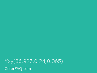 Yxy 36.927,0.24,0.365 Color is a normal cyan color and the nearest color is Light Sea Green #20b2aa. Hex code #27b7a2 and RGB value is rgb(39,183,162). In RGB color space, this color is composed of 15% red, 72% green, 64% blue, In CMYK color space, this color is composed of 79% cyan, 0% magenta, 11% yellow , 28% black , In HSL color space, this color has a hue angle of 171° , 65% saturation and 44% lightness.