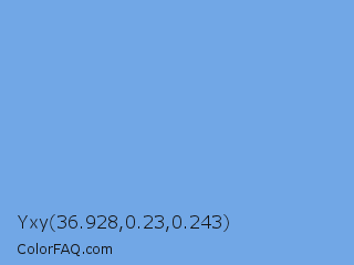 Yxy 36.928,0.23,0.243 Color is a light blue color and the nearest color is Little Boy Blue #6ca0dc. Hex code #71a7e6 and RGB value is rgb(113,167,230). In RGB color space, this color is composed of 44% red, 65% green, 90% blue, In CMYK color space, this color is composed of 51% cyan, 27% magenta, 0% yellow , 10% black , In HSL color space, this color has a hue angle of 212° , 70% saturation and 67% lightness.