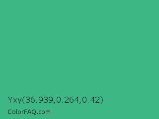 Yxy 36.939,0.264,0.42 Color is a normal green color and the nearest color is Mint #3eb489. Hex code #3db884 and RGB value is rgb(61,184,132). In RGB color space, this color is composed of 24% red, 72% green, 52% blue, In CMYK color space, this color is composed of 67% cyan, 0% magenta, 28% yellow , 28% black , In HSL color space, this color has a hue angle of 155° , 50% saturation and 48% lightness.