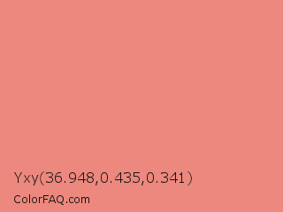 Yxy 36.948,0.435,0.341 Color is a light red color and the nearest color is Light Coral #f08080. Hex code #ec887e and RGB value is rgb(236,136,126). In RGB color space, this color is composed of 93% red, 53% green, 49% blue, In CMYK color space, this color is composed of 0% cyan, 42% magenta, 47% yellow , 7% black , In HSL color space, this color has a hue angle of 5° , 74% saturation and 71% lightness.