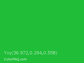 Yxy 36.972,0.294,0.558 Color is a normal green color and the nearest color is Wageningen Green #34b233. Hex code #1fbd38 and RGB value is rgb(31,189,56). In RGB color space, this color is composed of 12% red, 74% green, 22% blue, In CMYK color space, this color is composed of 84% cyan, 0% magenta, 70% yellow , 26% black , In HSL color space, this color has a hue angle of 129° , 72% saturation and 43% lightness.