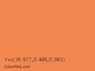 Yxy 36.977,0.488,0.383 Color is a light orange color and the nearest color is Coral #ff7f50. Hex code #f38751 and RGB value is rgb(243,135,81). In RGB color space, this color is composed of 95% red, 53% green, 32% blue, In CMYK color space, this color is composed of 0% cyan, 44% magenta, 67% yellow , 5% black , In HSL color space, this color has a hue angle of 20° , 87% saturation and 64% lightness.