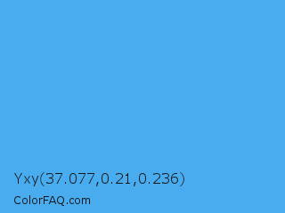 Yxy 37.077,0.21,0.236 Color is a light blue color and the nearest color is Picton Blue #45b1e8. Hex code #48acef and RGB value is rgb(72,172,239). In RGB color space, this color is composed of 28% red, 67% green, 94% blue, In CMYK color space, this color is composed of 70% cyan, 28% magenta, 0% yellow , 6% black , In HSL color space, this color has a hue angle of 204° , 84% saturation and 61% lightness.