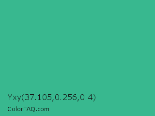 Yxy 37.105,0.256,0.4 Color is a normal green color and the nearest color is Mountain Meadow #30ba8f. Hex code #38b88f and RGB value is rgb(56,184,143). In RGB color space, this color is composed of 22% red, 72% green, 56% blue, In CMYK color space, this color is composed of 70% cyan, 0% magenta, 22% yellow , 28% black , In HSL color space, this color has a hue angle of 161° , 53% saturation and 47% lightness.