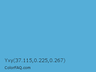 Yxy 37.115,0.225,0.267 Color is a normal blue color and the nearest color is Shakespeare #4eabd1. Hex code #55aed8 and RGB value is rgb(85,174,216). In RGB color space, this color is composed of 33% red, 68% green, 85% blue, In CMYK color space, this color is composed of 61% cyan, 19% magenta, 0% yellow , 15% black , In HSL color space, this color has a hue angle of 199° , 63% saturation and 59% lightness.