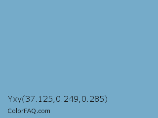 Yxy 37.125,0.249,0.285 Color is a light blue color and the nearest color is Moonstone Blue #73a9c2. Hex code #75abc9 and RGB value is rgb(117,171,201). In RGB color space, this color is composed of 46% red, 67% green, 79% blue, In CMYK color space, this color is composed of 42% cyan, 15% magenta, 0% yellow , 21% black , In HSL color space, this color has a hue angle of 201° , 44% saturation and 62% lightness.