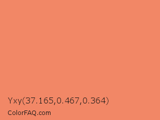 Yxy 37.165,0.467,0.364 Color is a light red color and the nearest color is Salmon #ff8c69. Hex code #f28766 and RGB value is rgb(242,135,102). In RGB color space, this color is composed of 95% red, 53% green, 40% blue, In CMYK color space, this color is composed of 0% cyan, 44% magenta, 58% yellow , 5% black , In HSL color space, this color has a hue angle of 14° , 84% saturation and 67% lightness.