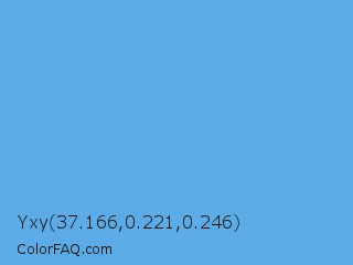 Yxy 37.166,0.221,0.246 Color is a light blue color and the nearest color is Blue Jeans #5dadec. Hex code #5dabe6 and RGB value is rgb(93,171,230). In RGB color space, this color is composed of 36% red, 67% green, 90% blue, In CMYK color space, this color is composed of 60% cyan, 26% magenta, 0% yellow , 10% black , In HSL color space, this color has a hue angle of 206° , 73% saturation and 63% lightness.