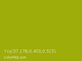 Yxy 37.178,0.403,0.515 Color is a normal yellow color and the nearest color is Pistachio Green #9dc209. Hex code #9ead0a and RGB value is rgb(158,173,10). In RGB color space, this color is composed of 62% red, 68% green, 4% blue, In CMYK color space, this color is composed of 9% cyan, 0% magenta, 94% yellow , 32% black , In HSL color space, this color has a hue angle of 66° , 89% saturation and 36% lightness.