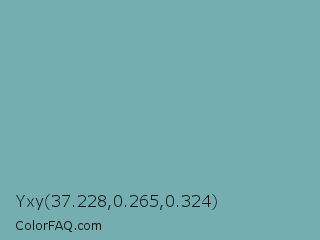 Yxy 37.228,0.265,0.324 Color is a normal cyan color and the nearest color is Gulf Stream #80b3ae. Hex code #75aeb1 and RGB value is rgb(117,174,177). In RGB color space, this color is composed of 46% red, 68% green, 69% blue, In CMYK color space, this color is composed of 34% cyan, 2% magenta, 0% yellow , 31% black , In HSL color space, this color has a hue angle of 183° , 28% saturation and 58% lightness.