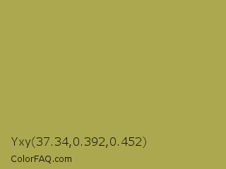 Yxy 37.34,0.392,0.452 Color is a normal yellow color and the nearest color is Husk #b7a458. Hex code #aca84f and RGB value is rgb(172,168,79). In RGB color space, this color is composed of 67% red, 66% green, 31% blue, In CMYK color space, this color is composed of 0% cyan, 2% magenta, 54% yellow , 33% black , In HSL color space, this color has a hue angle of 57° , 37% saturation and 49% lightness.