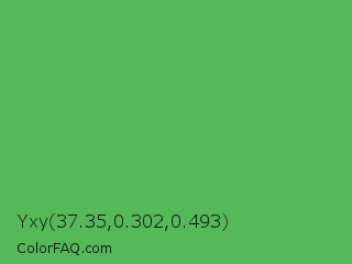 Yxy 37.35,0.302,0.493 Color is a normal green color and the nearest color is Fern #63b76c. Hex code #55b959 and RGB value is rgb(85,185,89). In RGB color space, this color is composed of 33% red, 73% green, 35% blue, In CMYK color space, this color is composed of 54% cyan, 0% magenta, 52% yellow , 27% black , In HSL color space, this color has a hue angle of 122° , 42% saturation and 53% lightness.