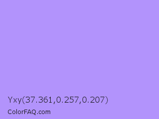 Yxy 37.361,0.257,0.207 Color is a light indigo color and the nearest color is Biloba Flower #b2a1ea. Hex code #b293fc and RGB value is rgb(178,147,252). In RGB color space, this color is composed of 70% red, 58% green, 99% blue, In CMYK color space, this color is composed of 29% cyan, 42% magenta, 0% yellow , 1% black , In HSL color space, this color has a hue angle of 258° , 95% saturation and 78% lightness.