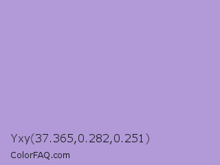 Yxy 37.365,0.282,0.251 Color is a light violet color and the nearest color is Light Pastel Purple #b19cd9. Hex code #b19ad7 and RGB value is rgb(177,154,215). In RGB color space, this color is composed of 69% red, 60% green, 84% blue, In CMYK color space, this color is composed of 18% cyan, 28% magenta, 0% yellow , 16% black , In HSL color space, this color has a hue angle of 263° , 43% saturation and 72% lightness.