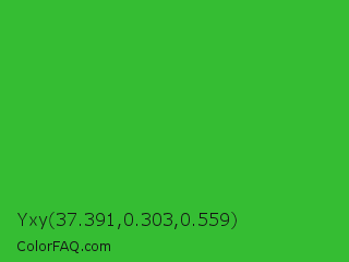Yxy 37.391,0.303,0.559 Color is a normal green color and the nearest color is Wageningen Green #34b233. Hex code #35bd33 and RGB value is rgb(53,189,51). In RGB color space, this color is composed of 21% red, 74% green, 20% blue, In CMYK color space, this color is composed of 72% cyan, 0% magenta, 73% yellow , 26% black , In HSL color space, this color has a hue angle of 119° , 58% saturation and 47% lightness.