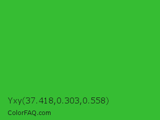 Yxy 37.418,0.303,0.558 Color is a normal green color and the nearest color is Wageningen Green #34b233. Hex code #36bd33 and RGB value is rgb(54,189,51). In RGB color space, this color is composed of 21% red, 74% green, 20% blue, In CMYK color space, this color is composed of 71% cyan, 0% magenta, 73% yellow , 26% black , In HSL color space, this color has a hue angle of 119° , 58% saturation and 47% lightness.