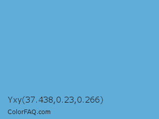 Yxy 37.438,0.23,0.266 Color is a light blue color and the nearest color is Little Boy Blue #6ca0dc. Hex code #61add9 and RGB value is rgb(97,173,217). In RGB color space, this color is composed of 38% red, 68% green, 85% blue, In CMYK color space, this color is composed of 55% cyan, 20% magenta, 0% yellow , 15% black , In HSL color space, this color has a hue angle of 202° , 61% saturation and 62% lightness.