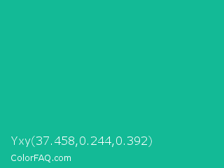 Yxy 37.458,0.244,0.392 Color is a normal cyan color and the nearest color is Mountain Meadow Crayola #1ab385. Hex code #13ba96 and RGB value is rgb(19,186,150). In RGB color space, this color is composed of 7% red, 73% green, 59% blue, In CMYK color space, this color is composed of 90% cyan, 0% magenta, 19% yellow , 27% black , In HSL color space, this color has a hue angle of 167° , 81% saturation and 40% lightness.