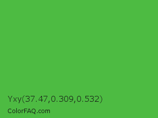Yxy 37.47,0.309,0.532 Color is a normal green color and the nearest color is Apple #4fa83d. Hex code #4dbb42 and RGB value is rgb(77,187,66). In RGB color space, this color is composed of 30% red, 73% green, 26% blue, In CMYK color space, this color is composed of 59% cyan, 0% magenta, 65% yellow , 27% black , In HSL color space, this color has a hue angle of 115° , 48% saturation and 50% lightness.