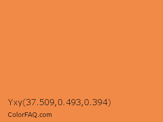 Yxy 37.509,0.493,0.394 Color is a light orange color and the nearest color is Jaffa #ef863f. Hex code #f28a47 and RGB value is rgb(242,138,71). In RGB color space, this color is composed of 95% red, 54% green, 28% blue, In CMYK color space, this color is composed of 0% cyan, 43% magenta, 71% yellow , 5% black , In HSL color space, this color has a hue angle of 24° , 87% saturation and 61% lightness.