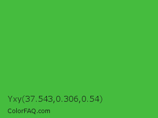 Yxy 37.543,0.306,0.54 Color is a normal green color and the nearest color is Apple #4fa83d. Hex code #45bc3e and RGB value is rgb(69,188,62). In RGB color space, this color is composed of 27% red, 74% green, 24% blue, In CMYK color space, this color is composed of 63% cyan, 0% magenta, 67% yellow , 26% black , In HSL color space, this color has a hue angle of 117° , 50% saturation and 49% lightness.