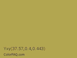 Yxy 37.57,0.4,0.443 Color is a normal yellow color and the nearest color is Husk #b7a458. Hex code #b4a651 and RGB value is rgb(180,166,81). In RGB color space, this color is composed of 71% red, 65% green, 32% blue, In CMYK color space, this color is composed of 0% cyan, 8% magenta, 55% yellow , 29% black , In HSL color space, this color has a hue angle of 52° , 40% saturation and 51% lightness.