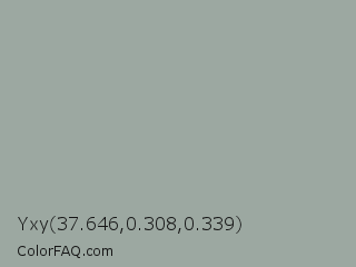 Yxy 37.646,0.308,0.339 Color is a light green color and the nearest color is Pewter #96a8a1. Hex code #9ca8a1 and RGB value is rgb(156,168,161). In RGB color space, this color is composed of 61% red, 66% green, 63% blue, In CMYK color space, this color is composed of 7% cyan, 0% magenta, 4% yellow , 34% black , In HSL color space, this color has a hue angle of 145° , 6% saturation and 64% lightness.