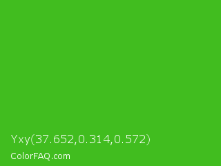 Yxy 37.652,0.314,0.572 Color is a normal green color and the nearest color is Kelly Green #4cbb17. Hex code #41bd1f and RGB value is rgb(65,189,31). In RGB color space, this color is composed of 25% red, 74% green, 12% blue, In CMYK color space, this color is composed of 66% cyan, 0% magenta, 84% yellow , 26% black , In HSL color space, this color has a hue angle of 107° , 72% saturation and 43% lightness.