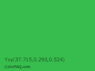 Yxy 37.715,0.293,0.524 Color is a normal green color and the nearest color is Wageningen Green #34b233. Hex code #37bd4d and RGB value is rgb(55,189,77). In RGB color space, this color is composed of 22% red, 74% green, 30% blue, In CMYK color space, this color is composed of 71% cyan, 0% magenta, 59% yellow , 26% black , In HSL color space, this color has a hue angle of 130° , 55% saturation and 48% lightness.