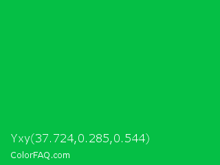 Yxy 37.724,0.285,0.544 Color is a normal green color and the nearest color is Dark Pastel Green #03c03c. Hex code #05bf45 and RGB value is rgb(5,191,69). In RGB color space, this color is composed of 2% red, 75% green, 27% blue, In CMYK color space, this color is composed of 97% cyan, 0% magenta, 64% yellow , 25% black , In HSL color space, this color has a hue angle of 141° , 95% saturation and 38% lightness.
