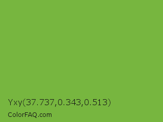 Yxy 37.737,0.343,0.513 Color is a normal green color and the nearest color is Sushi #87ab39. Hex code #77b63f and RGB value is rgb(119,182,63). In RGB color space, this color is composed of 47% red, 71% green, 25% blue, In CMYK color space, this color is composed of 35% cyan, 0% magenta, 65% yellow , 29% black , In HSL color space, this color has a hue angle of 92° , 49% saturation and 48% lightness.