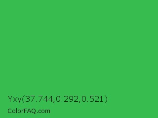 Yxy 37.744,0.292,0.521 Color is a normal green color and the nearest color is Chateau Green #40a860. Hex code #37bd4f and RGB value is rgb(55,189,79). In RGB color space, this color is composed of 22% red, 74% green, 31% blue, In CMYK color space, this color is composed of 71% cyan, 0% magenta, 58% yellow , 26% black , In HSL color space, this color has a hue angle of 131° , 55% saturation and 48% lightness.