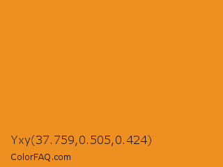 Yxy 37.759,0.505,0.424 Color is a normal orange color and the nearest color is Carrot Orange #ed9121. Hex code #ed8f21 and RGB value is rgb(237,143,33). In RGB color space, this color is composed of 93% red, 56% green, 13% blue, In CMYK color space, this color is composed of 0% cyan, 40% magenta, 86% yellow , 7% black , In HSL color space, this color has a hue angle of 32° , 85% saturation and 53% lightness.