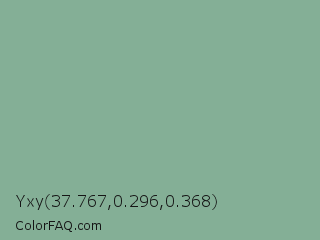 Yxy 37.767,0.296,0.368 Color is a normal green color and the nearest color is Envy #8ba690. Hex code #84af96 and RGB value is rgb(132,175,150). In RGB color space, this color is composed of 52% red, 69% green, 59% blue, In CMYK color space, this color is composed of 25% cyan, 0% magenta, 14% yellow , 31% black , In HSL color space, this color has a hue angle of 145° , 21% saturation and 60% lightness.