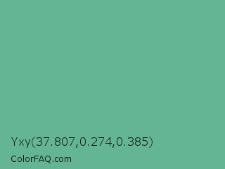 Yxy 37.807,0.274,0.385 Color is a normal green color and the nearest color is Silver Tree #66b58f. Hex code #63b593 and RGB value is rgb(99,181,147). In RGB color space, this color is composed of 39% red, 71% green, 58% blue, In CMYK color space, this color is composed of 45% cyan, 0% magenta, 19% yellow , 29% black , In HSL color space, this color has a hue angle of 155° , 36% saturation and 55% lightness.