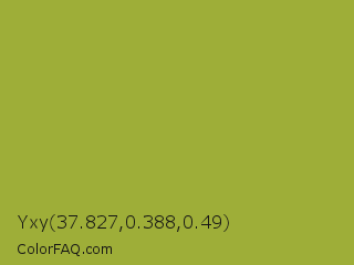 Yxy 37.827,0.388,0.49 Color is a normal yellow color and the nearest color is Sushi #87ab39. Hex code #9eae38 and RGB value is rgb(158,174,56). In RGB color space, this color is composed of 62% red, 68% green, 22% blue, In CMYK color space, this color is composed of 9% cyan, 0% magenta, 68% yellow , 32% black , In HSL color space, this color has a hue angle of 68° , 51% saturation and 45% lightness.