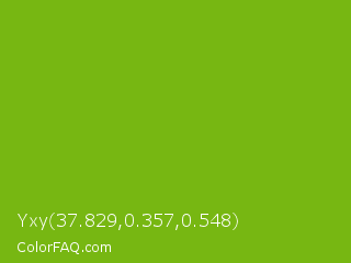 Yxy 37.829,0.357,0.548 Color is a normal green color and the nearest color is Lima #76bd17. Hex code #77b712 and RGB value is rgb(119,183,18). In RGB color space, this color is composed of 47% red, 72% green, 7% blue, In CMYK color space, this color is composed of 35% cyan, 0% magenta, 90% yellow , 28% black , In HSL color space, this color has a hue angle of 83° , 82% saturation and 39% lightness.