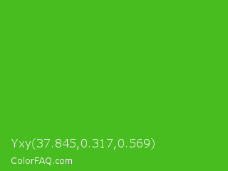 Yxy 37.845,0.317,0.569 Color is a normal green color and the nearest color is Kelly Green #4cbb17. Hex code #47bd20 and RGB value is rgb(71,189,32). In RGB color space, this color is composed of 28% red, 74% green, 13% blue, In CMYK color space, this color is composed of 62% cyan, 0% magenta, 83% yellow , 26% black , In HSL color space, this color has a hue angle of 105° , 71% saturation and 43% lightness.