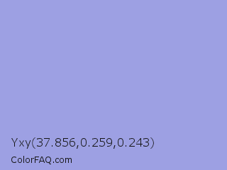 Yxy 37.856,0.259,0.243 Color is a light blue color and the nearest color is Dull Lavender #a899e6. Hex code #9da0e3 and RGB value is rgb(157,160,227). In RGB color space, this color is composed of 62% red, 63% green, 89% blue, In CMYK color space, this color is composed of 31% cyan, 30% magenta, 0% yellow , 11% black , In HSL color space, this color has a hue angle of 237° , 56% saturation and 75% lightness.