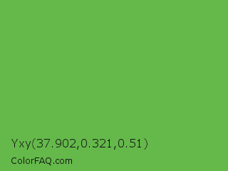 Yxy 37.902,0.321,0.51 Color is a normal green color and the nearest color is Green RYB #66b032. Hex code #64b94a and RGB value is rgb(100,185,74). In RGB color space, this color is composed of 39% red, 73% green, 29% blue, In CMYK color space, this color is composed of 46% cyan, 0% magenta, 60% yellow , 27% black , In HSL color space, this color has a hue angle of 106° , 44% saturation and 51% lightness.