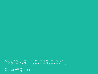 Yxy 37.911,0.239,0.371 Color is a normal cyan color and the nearest color is Light Sea Green #20b2aa. Hex code #19baa1 and RGB value is rgb(25,186,161). In RGB color space, this color is composed of 10% red, 73% green, 63% blue, In CMYK color space, this color is composed of 87% cyan, 0% magenta, 13% yellow , 27% black , In HSL color space, this color has a hue angle of 171° , 76% saturation and 41% lightness.