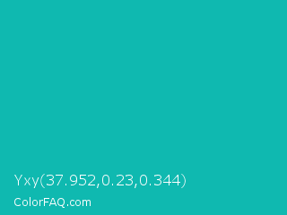 Yxy 37.952,0.23,0.344 Color is a normal cyan color and the nearest color is Tiffany Blue #0abab5. Hex code #0fb9b0 and RGB value is rgb(15,185,176). In RGB color space, this color is composed of 6% red, 73% green, 69% blue, In CMYK color space, this color is composed of 92% cyan, 0% magenta, 5% yellow , 27% black , In HSL color space, this color has a hue angle of 177° , 85% saturation and 39% lightness.