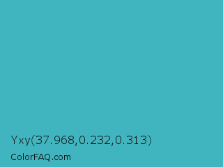 Yxy 37.968,0.232,0.313 Color is a normal cyan color and the nearest color is Pelorous #3eabbf. Hex code #41b5bf and RGB value is rgb(65,181,191). In RGB color space, this color is composed of 25% red, 71% green, 75% blue, In CMYK color space, this color is composed of 66% cyan, 5% magenta, 0% yellow , 25% black , In HSL color space, this color has a hue angle of 185° , 50% saturation and 50% lightness.
