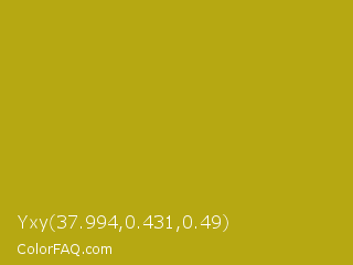 Yxy 37.994,0.431,0.49 Color is a normal yellow color and the nearest color is Sahara #b7a214. Hex code #b6a812 and RGB value is rgb(182,168,18). In RGB color space, this color is composed of 71% red, 66% green, 7% blue, In CMYK color space, this color is composed of 0% cyan, 8% magenta, 90% yellow , 29% black , In HSL color space, this color has a hue angle of 55° , 82% saturation and 39% lightness.